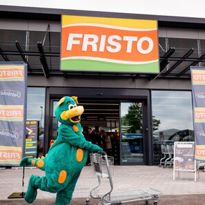 Der Eingang des FRISTO Getränkemarktes in Buchloe, neu eröffnet 2023, mit dem überarbeitetem Firmenlogo, dekorativen Luftballons und tollen Aktionen.