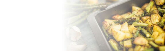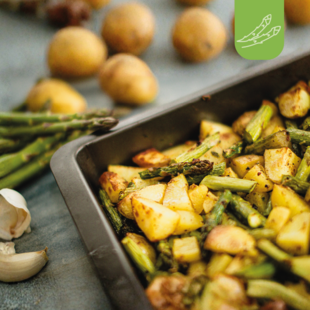 Kartoffeln halbieren, Spargel in Stücke schneiden, Champignons halbieren & Knoblauch andrücken.